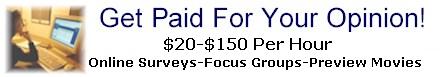 Would you like to get paid between $25-$90 just for completing simple 10-25 minute surveys? Would you like to complete several of these each day? Would you like to earn between $75-$150 for participating in 30 to 60 minute panels and forums? If you answered yes, then we can put you to work today! Get Paid TO WORK ONLINE AT HOME! $10 to $125 per hour!